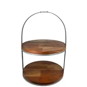 Elegant two-tier stand with wooden shelves and metal frame. Perfect for display or storage.