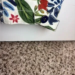 Sleeveless V-neck jumpsuit with a self-tie belt. Bold bird and leaf print in blue, green, and pops of red. Relaxed, tapered leg for an easy silhouette. Closes with a zipper in the front. Can easily be dressed up or down.