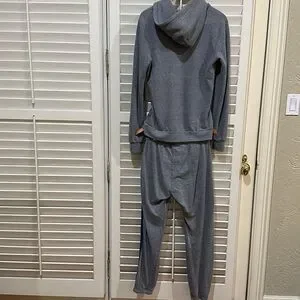 Comfortable gray Aviator Nation set with vibrant stripes. Includes hoodie and pants. Ideal for cozy nights.