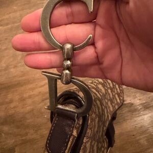 Hardware: It features the signature "D" stirrup charm hanging from the front strap and "CD" metal initials connecting the handle to the bag.