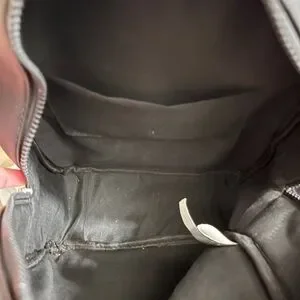 Black faux-leather backpack featuring striking red and blue illustrated artwork on the front. Compact design with a front zip pocket and adjustable straps for everyday comfort. Ideal for fans seeking a bold, black statement accessory with colorful accents.