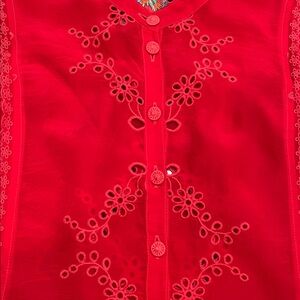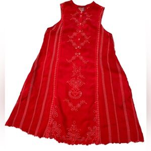 Vibrant red sleeveless dress with eyelet embroidery. Features colorful embroidered Johnny Was label at neckline. Button-front placket and fabric-covered button detail. Feminine, bold look. Excellent used condition