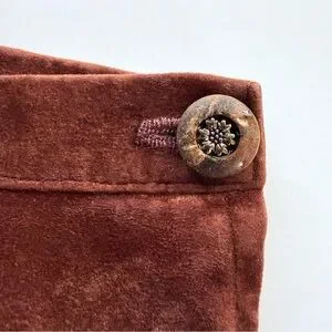 Vintage 1970s velveteen mini skirt in a rich, warm, brown color. Two front slits, hidden side zip closure, and a gilt floral detail button. No labels. Fits like a contemporary US small in my opinion - see photos for images of it laying flat with a measuring tape.