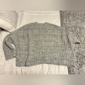 Cropped ribbed knit crewneck sweater. Soft oversized silhouette. Neutral gray color for easy pairing. Simple design for everyday wear.