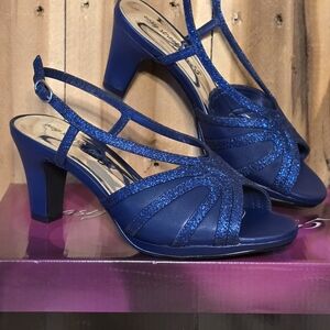 Step out in dazzling confidence with these stunning Easy Street Alive 5 - 8 W ( Wide width) Starlight glitz slingback heels. Designed to sparkle with every step, these beauties feature shimmering sapphire-blue glitter straps that elegantly fan across the foot for a sophisticated, eye-catching look. The open-toe design keeps them fresh and flirty, while the adjustable slingback strap provides a secure, comfortable fit for all-night wear.
