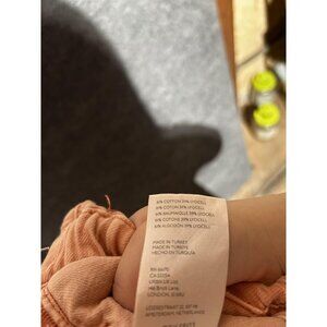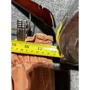 Pre-owned pants with light overall wear from prior use and laundering. Peachy pink twill fabric shows general wrinkling and softening but remains clean and structurally intact without stains, holes, or tears. Elastic waistband, pockets, and seams are functional, and interior Pilcro branding, size, and care labels are present and legible.