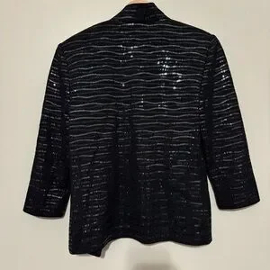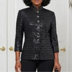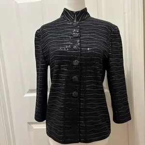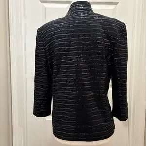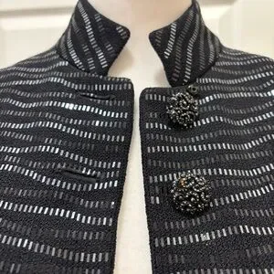 Elegant black blazer featuring a subtle textured stripe pattern. Stand collar and decorative embellished buttons. Open-front silhouette for easy layering. Three-quarter sleeves for versatile styling. Refined piece for both professional and evening looks.