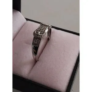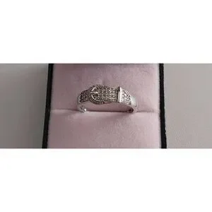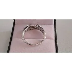 This beauty sparkles with 1/4 carat of genuine naturally mined diamonds in a pretty buckle design. The stones are round cut and pave set and this ring looks great on any finger. It is done in 925 solid sterling silver and is heavily layered in platinum for a lifetime of shine and durability?. It is size 10.