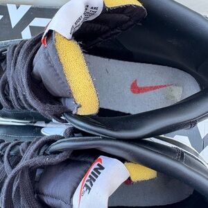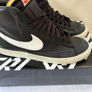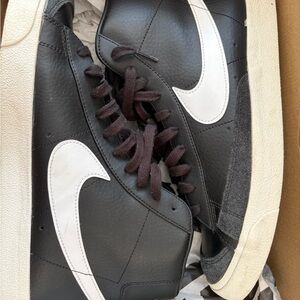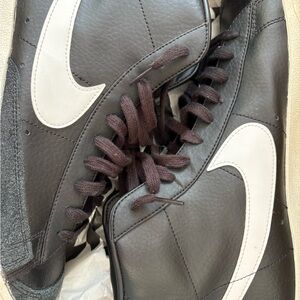 Experience the perfect blend of style and comfort with these Nike high-top sneakers. Featuring a sleek black leather upper with a contrasting white Swoosh, these shoes are designed for those who appreciate classic sneaker aesthetics. The high-top collar provides added support, making them ideal for everyday wear. In good presented condition owned condition have any questions feel free to ask.