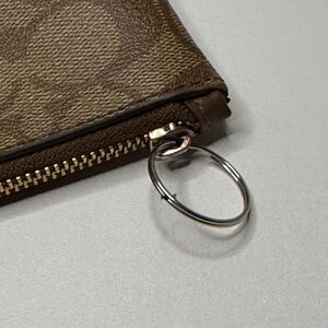 zip wristlet has a length of 7.75 inches, a height of 4.75 inches, a width of 0.5 inches. It features a coated canvas and a fabric lining . The wristlet includes two credit card slots and a zip closure. The zip part key ring is not the original. wristlet strap not included.. The last photo shows piping rubbed off, but there are no rips, and the wristlet remains very functional. Besides those minor flaws, bag is in excellent condition