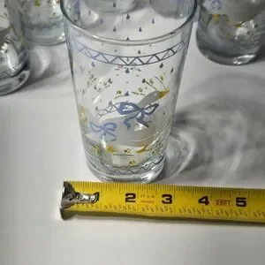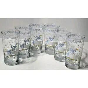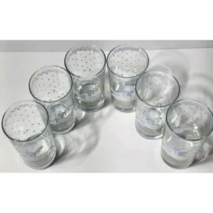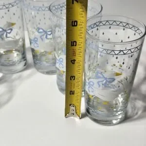 This vintage set of 6 Farm Country Goose Glass Tumblers by Anchor Hocking features a charming blue bow design, perfect for all occasions. Made of durable glass with a glossy finish and a weighted bottom, these round tumblers are decorated with a country goose pattern, adding a touch of farmhouse style to your tableware collection. Produced in 1987 using a pressed glass technique, these tumblers are easy to care for and dishwasher safe, making them a practical and decorative addition to your home.