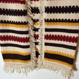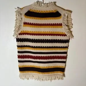 A vintage knit vest crafted from 100% pure wool. This sleeveless piece showcases a bold striped pattern in cream brown yellow and burgundy complemented by fringed trim along the armholes neckline and hem. The open front design adds to its laid-back aesthetic. Perfect for layering over a simple tee or a long-sleeved blouse for a casual outing or a weekend getaway.