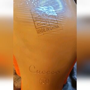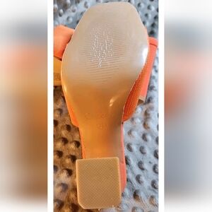 Women's Orange Cuccoo Block Heel Square Toe Slide Shoes. Size 8 US 38 EU. Pre-owned in excellent condition. Shoes don't appear to have ever been worn. Small scuff on inside sole (see picture for details). These block heel slides represent the brand's approach to combining comfort with contemporary aesthetics.
