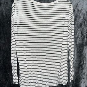 Lightweight long sleeve tee with a relaxed V-neck. Horizontal black stripes on a white base. Soft, drapey fabric for easy layering. Casual staple for everyday wear.
