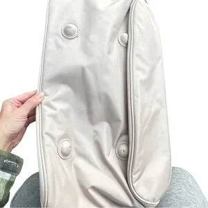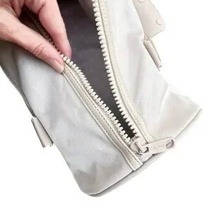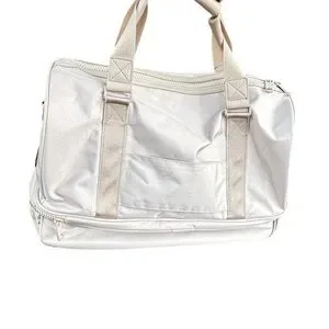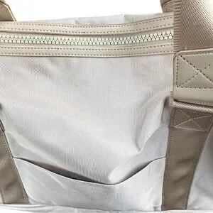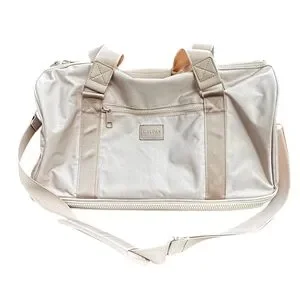 Elegant beige duffel by Calpak. Features front pocket and sturdy straps.