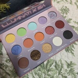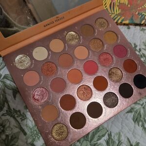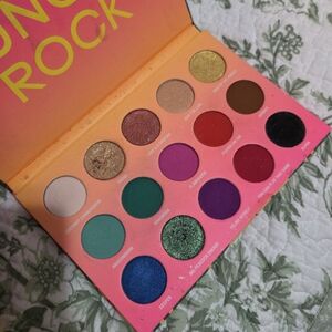 Bundle of vibrant eyeshadow palettes. Includes a pink a Wet n Wild bretman Rock palette and a small Colour Pop mini palette. Bright coral, teal, green, red, and maroon tones .