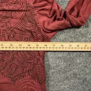 This gorgeous prAna hoodie features a unique, intricate graphic print on the front and back in a warm, earthy terracotta orange. Crafted with the brand’s signature focus on sustainability and comfort, it includes a flattering V-neckline and a cozy hood with adjustable drawstrings. It is perfect for yoga, hiking, or a boho-inspired casual look.