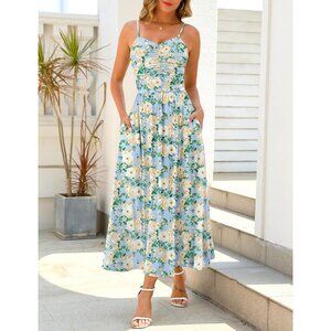 Adjustable spaghetti strap dress / Ruched bodice / Beach dress with pockets / Cute open back / Elastic waist / Flattering A-line casual dress / Trendy V neck backless long sundress / Sleeveless maxi dresses for women 2025 / Boho floral print
