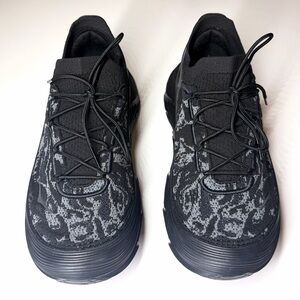 Chunky platform sneakers with textured knit upper. All-black design with subtle gray marbled pattern. Thick sculpted sole for bold style. Lace-up closure. Sporty and modern look.