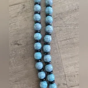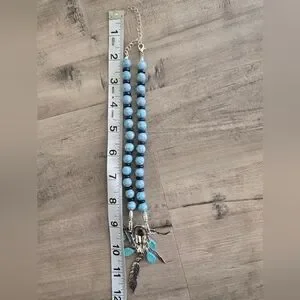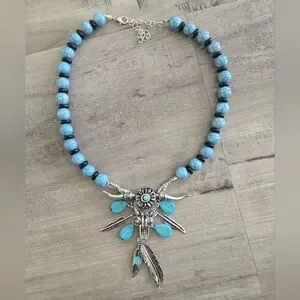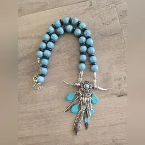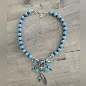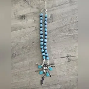 Ox Cow Skull Dangle Feathers Necklace Silver Blue/Black Beads Western Cowgirl