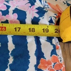 Vibrant floral blouse with stripes. Features blue, pink, and white colors. Button-up front. Perfect for casual wear.