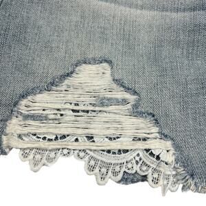Features: zip fly with button closure, pockets, belt loops, factory distressing, lace insets, mini length, casual, everyday, basics, summer, destroyed, distressed, festival, boho, bohemian, shabby chic, jean skirt, denim skirt