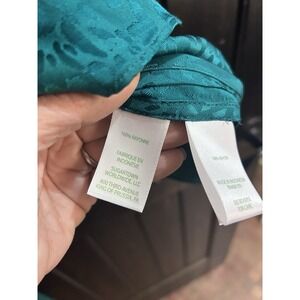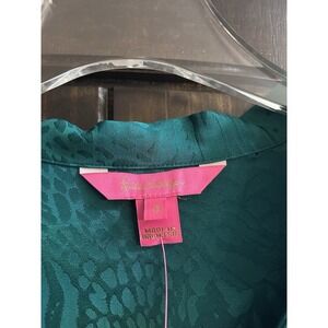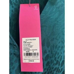 The Lilly Pulitzer Nicolina dress is a stylish option for women featuring a unique Evergreen Party Animal Jacquard fabric. This knee-length dress has long balloon sleeves with a tie closure, making it perfect for summer, fall, and spring seasons. The dress is adorned with adding a playful touch to its design. It is brand new with tags, offering a chic and vibrant look for various occasions.