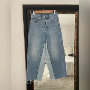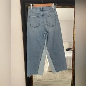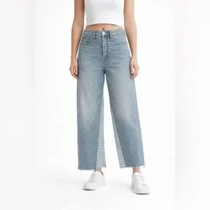 Light blue high-rise jeans with a wide-leg silhouette. Relaxed fit through the hip and thigh. Subtle faded wash and whiskering. Raw hem for an effortless edge. Pairs easily with casual tops and sneakers.