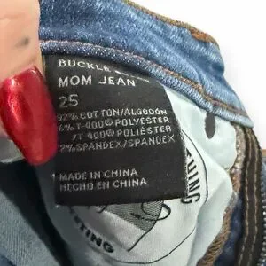 BUCKLE BLACK Women’s Light Wash Distressed Knee Mom Jeans Size 25 Style #88W1742A featuring a relaxed vintage-inspired fit with trendy knee distressing and shaping pocketing.