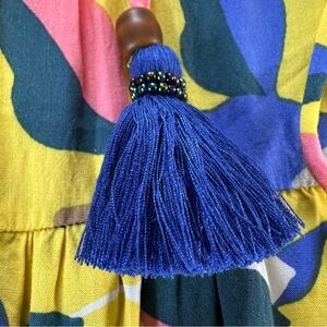 Features smocked stretchy bodice, flowy tiered skirt, long string with tassel detail to convert to halter top if desired.