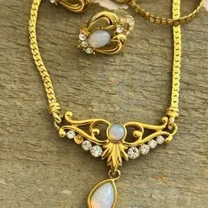 This exquisite jewelry set features a stunning combination of gold and opal. Perfect for adding a touch of elegance to any outfit.