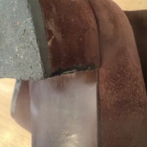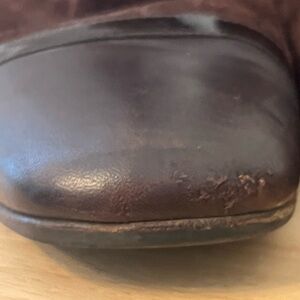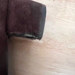 🌟🌟the suede has some scuffs on it. The front has rubbed areas with the little peeling, and the back heels are missing a little part of the heel area on the corner on the sides - both shoe’s