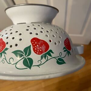 White enamel colander with red strawberry motif and green leaves. Dual side handles for easy grip. Charming vintage-inspired kitchen piece. Bright red and green colors add a pop to any kitchen. Made in Kora. selling as-is please look at pictures.