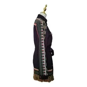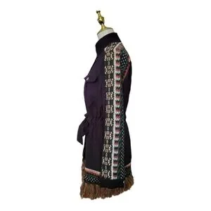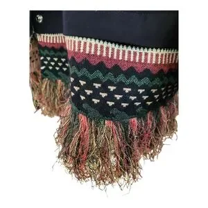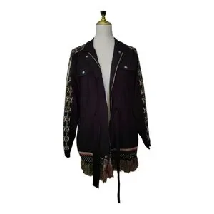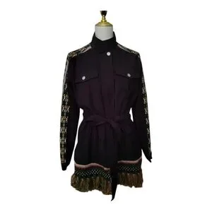 Stylish Drôle de Copine Paris women's jacket in size Large. Features a black rayon/nylon blend fabric with military-inspired design, zip and snap front closure, chest flap pockets, self-tie waist belt, and statement embroidered trim with multicolor fringe hem. Decorative woven detailing along sleeves and hem adds a unique bohemian touch. Perfect as a statement coat or layering piece.