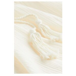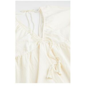 V-neck at front and back, horizontal ties at back of neck, and a gathered, elasticized seam below bust