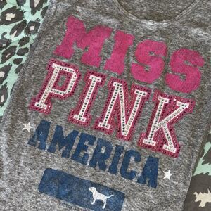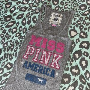 Gray ribbed tank with MISS PINK AMERICA on the front. MISS in pink graphic print, PINK block logo in pink & white with gorgeous faux diamond like rhinestones. AMERICA in blue graphic print with a white star at the beginning and end of America.