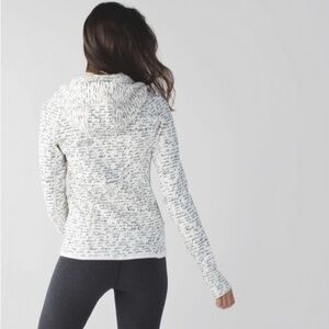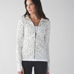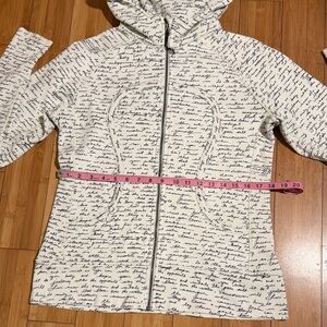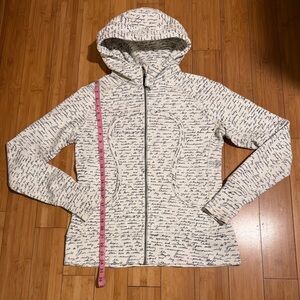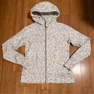 Cozy zip-up hoodie by lululemon athletica. White fabric all over with black handwritten-style script print. Full zip front and attached hood. Comfortable, casual layering piece.