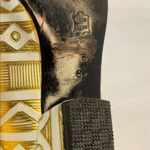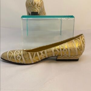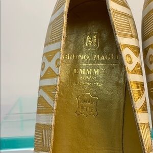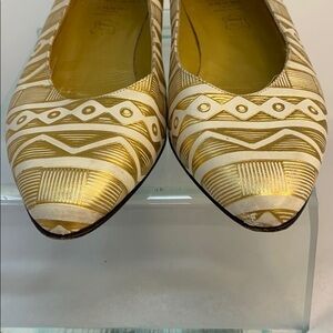 This is a wonderful pair of Bruno Magli Sz 6 Flat Gold White Leather Low Heel Flats. Gold and white leather geometric pattern. Gold Leather interior. Rectangular no slip 1/2” heel. A few minor scuffs throughout, but not too noticeable once on. Made in Italy