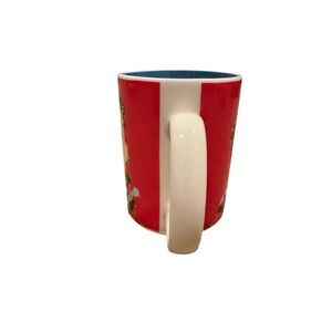 Red colored mug with pop art style portrait.