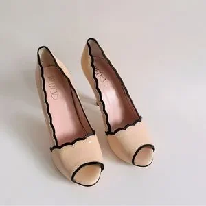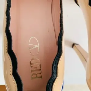 Red Valentino Scalloped Trim Patent leather peep toe pumps pale pink and black