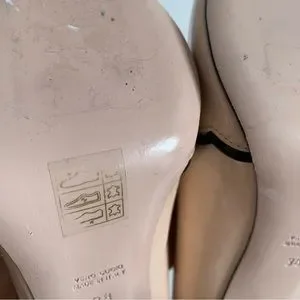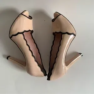 Adorable ladylike pale pink patent leather heels accentuated with black leather scalloped trim