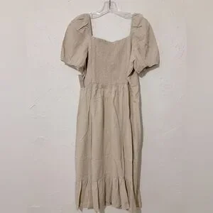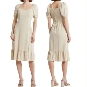 Tags: cream puff sleeve dress, linen midi dress, cottagecore dress, romantic summer dress, smocked back dress, square neck dress, neutral midi dress, minimalist dress, feminine ruffle dress, boho midi dress, casual wedding guest dress