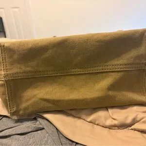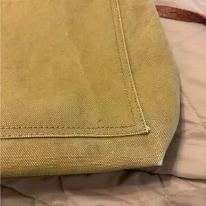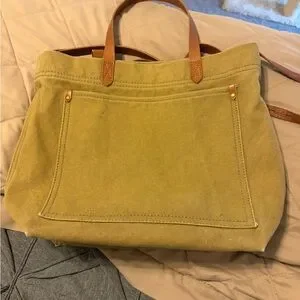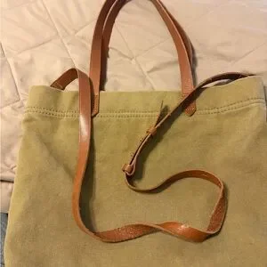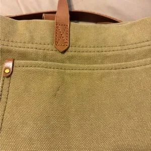 Chic olive canvas tote by Madewell. Features sturdy tan leather straps. Perfect for daily essentials. Smoke free home. 10.5” x 12”.
