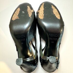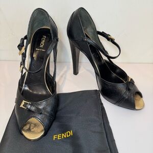 Fendi Black Leather Peep Toe D’Orsay Pumps W Gold Buckle Accents, Size 39. These beautiful heels have only been very gently worn and are in overall excellent condition. There is light wear throughout from normal usage, and some light wear on the buckles, all of which is largely unnoticeable when worn. Comes with Fendi dustbag, which has some leather wear on the tie from storage. Please refer to all pictures.