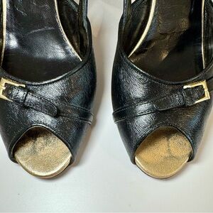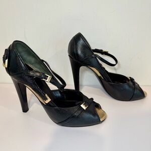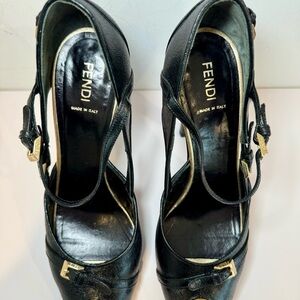 Fendi Black Leather Peep Toe D’Orsay Pumps W Gold Buckle Accents, Size 39