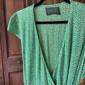 Lightweight wrap mini dress. V-neck with short sleeves. Side tie waist for a flattering fit. All-over white dotted print. Breezy, casual silhouette. Perfect for spring and summer!