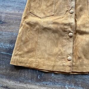 Tobacco brown suede a-line 70s mini skirt from Monki. 100% leather suede with 100% polyester lining, size EU 38. Button front, also features two front pockets. This item has wear and discoloration throughout, this should be professionally cleaned only but there is no guarantee that all marks will lift.