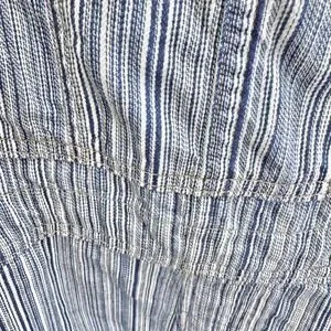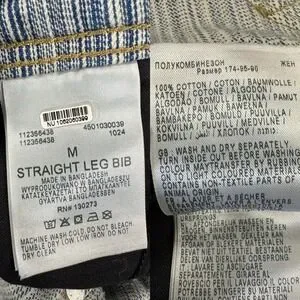 Features: Adjustable brace straps, front functional bib pocket, yarn-dyed striped fabrication, soft rigid denim