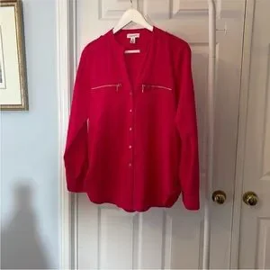 Stylish fuchsia blouse with button-up front. Features zippered chest pockets. Ideal for versatile wear.