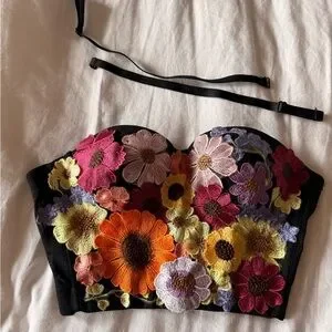 A striking black bustier crop top with colorful embroidered floral appliqués. Features vibrant orange, pink, purple, cream, yellow and green floral detailing for a bold, feminine look. Supportive cups and adjustable straps create a flattering silhouette. Perfect for pairing with high-waist jeans or skirts for a statement outfit.